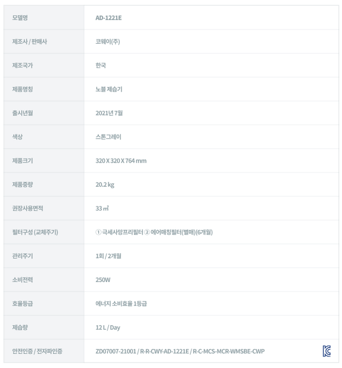 4. 코웨이 노블 제습기 (코웨이 제습 청정기, AD-1221E)