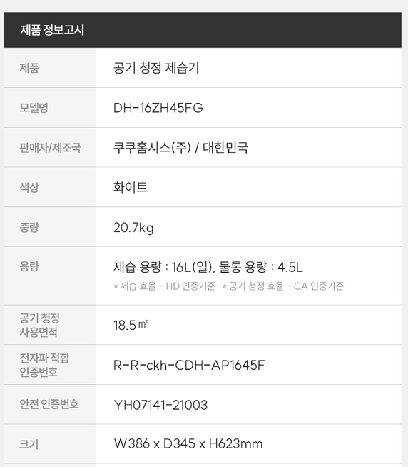 3. 쿠쿠 공기 청정 제습기 (DH-16ZH45FG)
